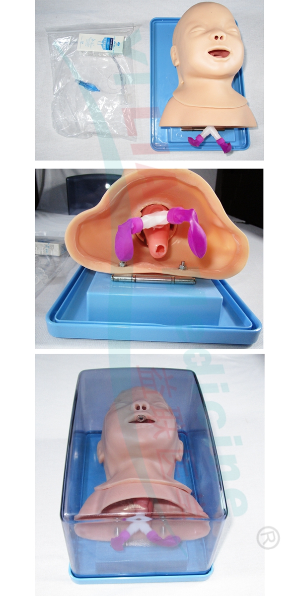 嬰兒氣管插管訓(xùn)練模型氣道狹窄并且需要插管多是由于氣道堵塞或者呼吸功能不佳,缺氧時間過長會導(dǎo)致新生兒缺血缺氧腦病,后果很嚴重,因此需要最快速度插管。操作者站模型頭側(cè),將口張開;使用時口、咽、喉先噴以肥皂水和洗滌精進行;左手握喉鏡把鏡片伸入舌根,向上提拉,此時就會看到會厭軟骨,將鏡片逐漸移至舌根會厭各處,繼續(xù)上提鏡片,會厭軟骨就會反跳復(fù)牢鏡片,其下的菱形氣管口便清晰可見。右手拿氣管內(nèi)導(dǎo)入伸入口內(nèi)與潤滑劑接觸后,在直視下將導(dǎo)管插入氣管;關(guān)于氣管導(dǎo)管是否插入氣管,模型頭部頸部截面通出的半透明氣管支氣管部分可看到模型氣管導(dǎo)管;把模型頭豎起來,在其后孔內(nèi)扳開咽后壁可見氣管導(dǎo)管是否已插入氣管內(nèi);用氣囊面罩復(fù)蘇器的面罩端改接氣管導(dǎo)管,予以加壓充氣,模型肺就會擴大,說明導(dǎo)管插在氣管內(nèi)。