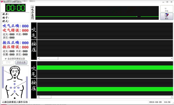 當(dāng)訓(xùn)練或考核操作時(shí)間結(jié)束后,即可進(jìn)行成績(jī)打印。按壓、吹氣正確錯(cuò)誤的次數(shù)及具體錯(cuò)誤原因,按壓、吹氣所產(chǎn)生的圖表數(shù)據(jù)統(tǒng)計(jì)、受訓(xùn)人的姓名、編號(hào)、成績(jī)、等功能打印,以供考試成績(jī)?cè)u(píng)定及存檔。