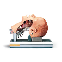 Solves the problem of teaching intubation techniques and airway management. Provides accurate simulation of mouth, nostrils, teeth, tongue, pharynx, epiglottis, vocal cords, trachea, esophagus, lungs, realistic lifting and tilting of head and movement of the spine. Open left side of face allows control over trainee's techniques. Transparent walls of pharynx and trachea permitting instructor to follow progress of endotracheal tube. Acoustic signals help trainee correct mistakes. Comes with access tray, lubricant, and carry case.
